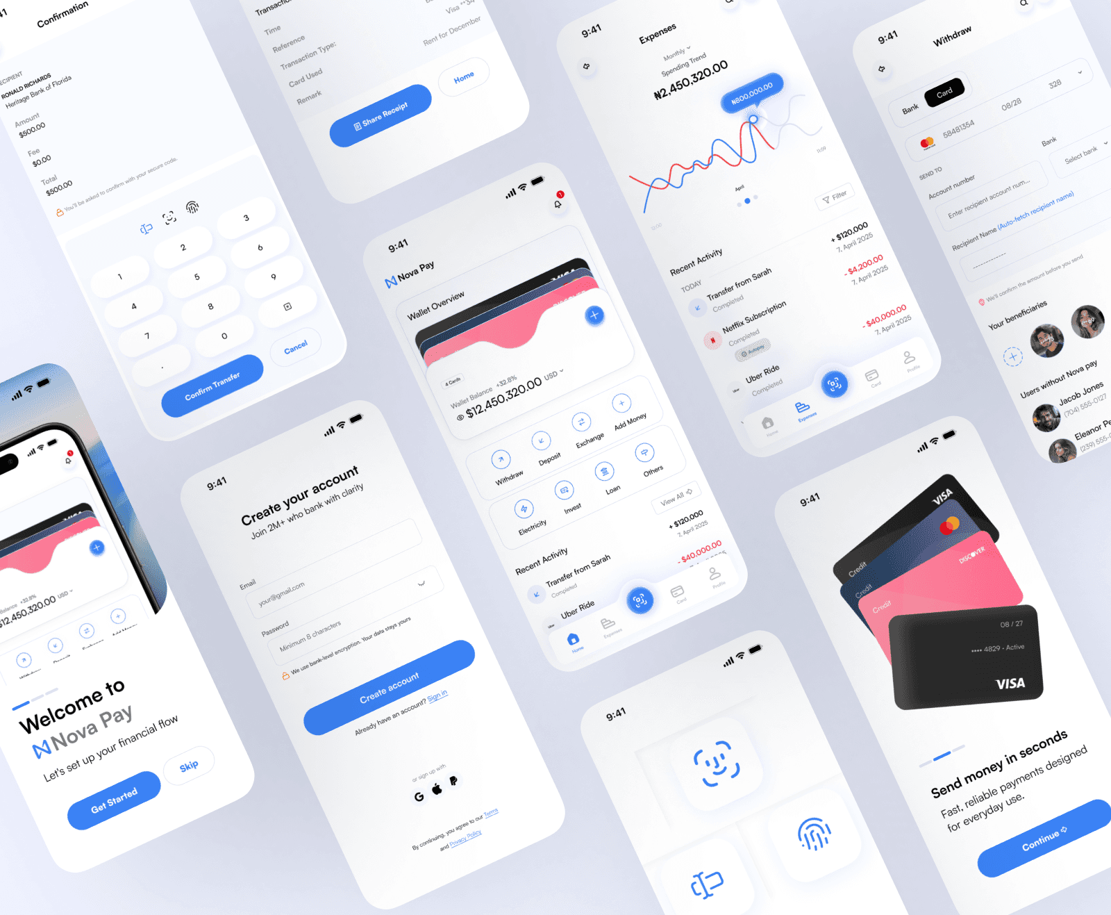Nova Pay explores a clean and intuitive financial experience, emphasizing clarity, trust, and ease of use across core wallet actions such as transfers, balances, and transaction history.